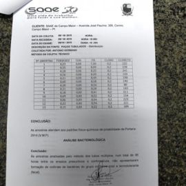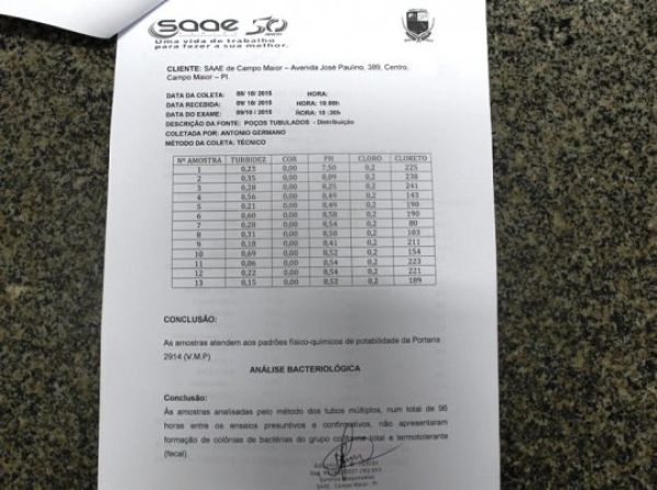 Dos 17 poços existentes na época, 04 deixaram de ser útil para o sistema de abastecimento e atualmente 13 poços operam na zona urbana da cidade. “Hoje 100% dos poços recebem tratamento e nosso químico realiza testes na água rotineiramente para identificar a potabilidade. A água distribuída é própria para o consumo humano porque nós tratamos”, explicou esclarecendo que se não houver tratamento, não é apropriado o consumo. Documentos abaixo mostram o teste feito pelo bioquímico Germano Junior comprovando a potabilidade da água de Campo Maior.