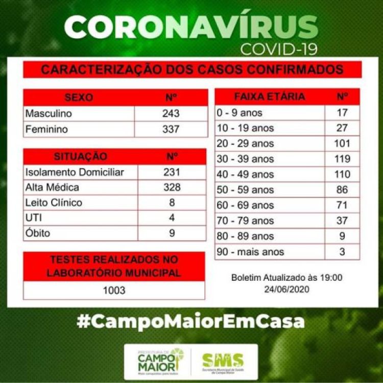 Em novo boletim epidemiológico divulgado pela Secretária de Saúde de Campo Maior na noite desta quarta-feira(24), foi registrado no bairro Cariri o acréscimo de mais 12 casos confirmados de Covid-19 nas últimas 24 horas.