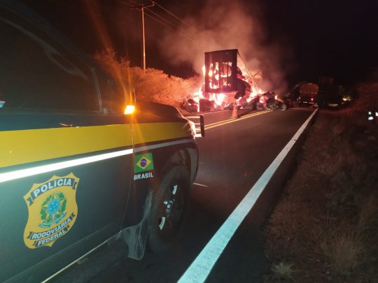 De acordo com informações da Polícia Rodoviária Federal, o acidente envolveu dois semirreboques que estavam atrelados a combinações de veículos distintos e pegaram fogo.