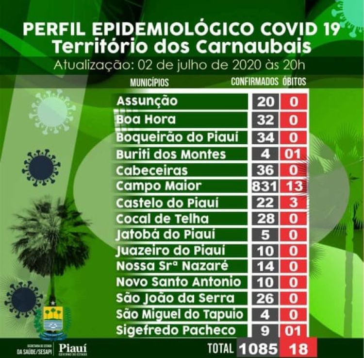 Em boletim epidemiologico, divuldado pela Secretaria de Saúde do Piauí (SESAPI), a região dos Carnaubais, que conta com 16 municipios, já registra o número de 1085 casos confimados com o novo coronavirus. No entanto, apenas 04 cidades tiveram vitimas do Covid-19. Buriti dos Montes (01), Campo Maior (13), Castelo do Piauí (03) e Sigefredo Pacheco com 01 morte.