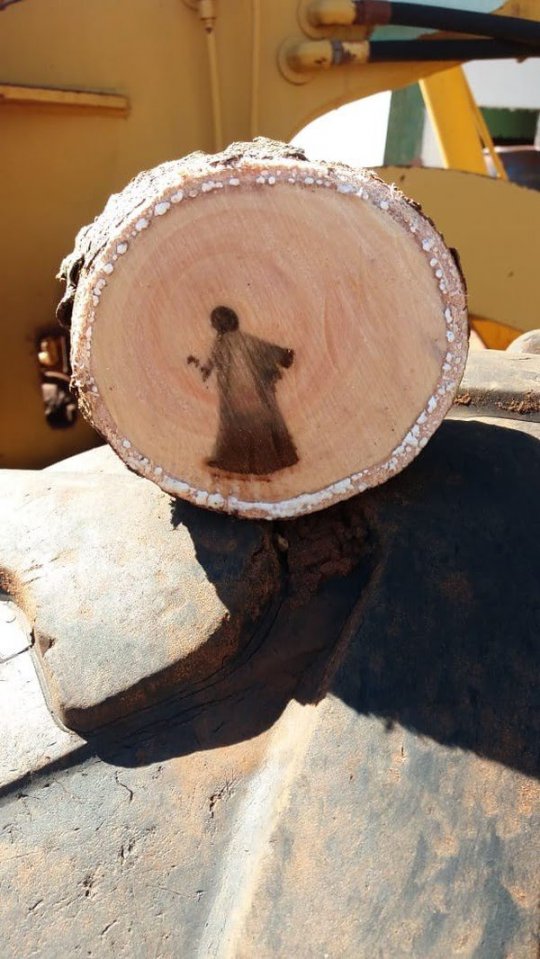 Logo em seguida, a corrente da motosserra, que era nova, quebrou. Houve a troca da corrente e quando o corte foi concluído, nos tocos que sobraram da poda e em um pedaço do tronco que restou, estava o desenho que intrigou a todos.