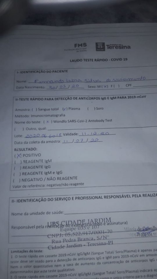 Em casa, Luzia Medeiros foi examinar o resultado do teste de Raimundo Nonato Menezes e percebeu que o resultado era positivo para Covid-19, mas de uma criança de dois meses de idade, Fernando Lira Silva do Nascimento, que nasceu no dia 30 de maio e também foi atendido na UBS da Cidade Jardim.