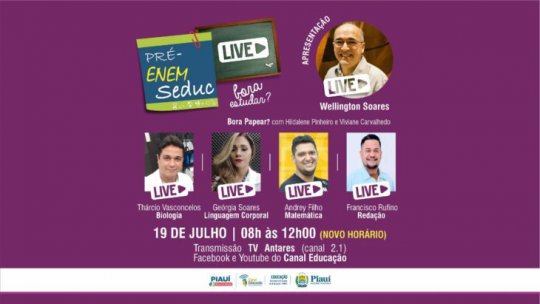 A Secretaria de Estado da Educação (Seduc) realiza, no próximo domingo (19), mais uma edição do Pré-Enem Live. Obedecendo às recomendações de isolamento social devido à pandemia da Covid-19, as aulas, que são exclusivamente on-line, acontecem em novo horário das 8h às 12h.