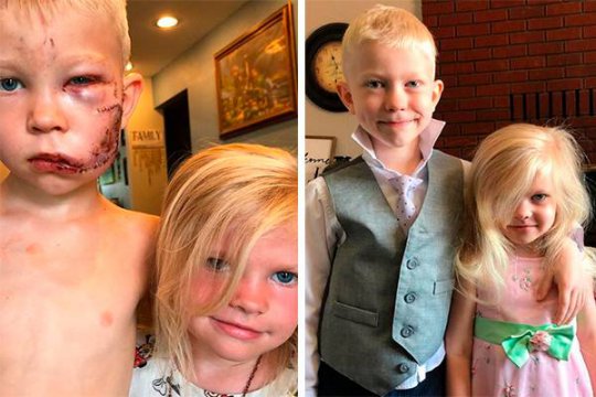 O animal atacou Bridger, mordendo o lado do rosto e da cabeça do garoto, disse Nikki. "Meu sobrinho é um herói que salvou a irmã pequena de um ataque de cachorro. Ele levou a mordida para que o animal não pegasse sua irmã", escreveu a tia no Instagram. Mesmo ferido, Bridger segurou a mão da irmã e correu "para mantê-la segura".