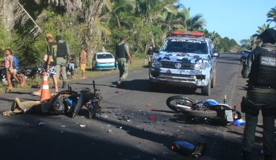 Com o choque, um dos corpos parou no acostamento, a cinco metros de distância da moto. A PM e o Samu não souberam identificar os nomes das vítimas.