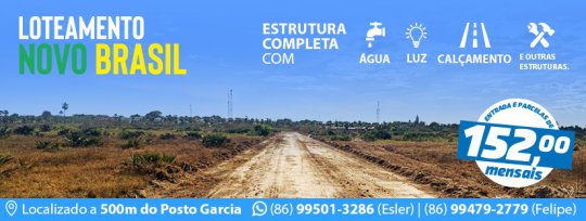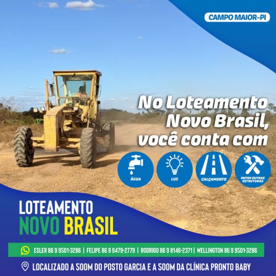 Já começou as vendas do Loteamento Novo Brasil, o mais novo loteamento de Campo Maior que fica a 500 metros da Clínica Pronto Baby em direção ao Velame. O local possui estrutura de água, energia, calçamento e outras estruturas de terraplanagem e saneamento para garantir a segurança dos moradores.