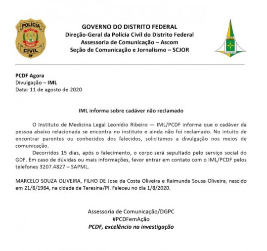 O Instituto de Medicina Legal de Brasília divulgou o nome do piauiense Marcelo Souza Oliveira, de 36 anos, para que familiares ou conhecidos possam reclamar seu corpo e realizar o devido velório e enterro.