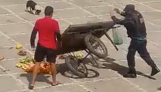 Nesta quinta-feira (27), dois policiais militares foram afastados de suas funções após um policial ser filmado derrubando produtos e virando um carrinho usado pelo vendedor ambulante.