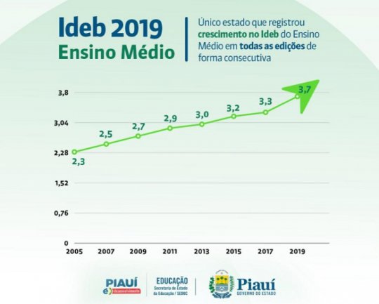 Assim como nos anos iniciais e finais do Ensino Fundamental, o Piauí também teve um aumento positivo no nível do Ensino Médio, registrando crescimento de 3,3 (2017) para 3,7 (2019). Um avanço histórico de 0.4 pontos, tornando-se uma das redes estaduais de Ensino Médio a registrar ganhos no Ideb em todas as edições de forma consecutiva.