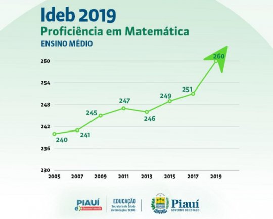 “Se analisarmos separadamente os componentes utilizados para chegar à média do Ideb, como aprendizagem dos estudantes em português e matemática, medido pela prova do Saeb, e o indicador relativo da taxa de aprovação, podemos observar como o Piauí avançou. Com relação ao desempenho dos alunos no Saeb, no Ensino Médio, saímos de 247 (2017) para 262 (2019), em português, e de 251 (2017) para 260 (2019), em matemática. Outro fator que impulsionou o crescimento do Estado nesta etapa foi o crescimento do índice de aprovação que passou de 86%, em 2017, para 87%, em 2019. Isso mostra que estamos no caminho certo e vamos continuar trabalhando para avançar cada vez mais”, destaca o secretário.