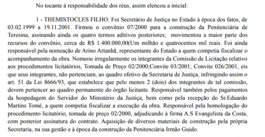 Todos são acusados de praticarem irregularidades em licitações na execução da obra da casa de detenção que fica na capital Teresina, segundo apontam relatórios técnicos da Controladoria Geral da União (CGU), da Polícia Federal e do Ministério Público Federal (MPF).