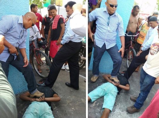 As imagem bombaram no mesmo momento na internet. J? no ch?o e sem, aparentmente, oferecer perigo, o adolescente ? pisado no pesco?o pelo secret?rio, enquanto outro policial, que faz a seguran?a de F?bio Abreu, pisa nas costas do preso.?