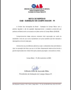 Na nota assinada pelo presidente da OAB de Campo Maior, Gilberto Azevedo, informou que o ato foi uma agressão excessiva por parte dos policiais militares e que o caso passará pelos procedimentos jurídicos cabíveis e cobrará por parte das autoridades apuração sobre o caso.
