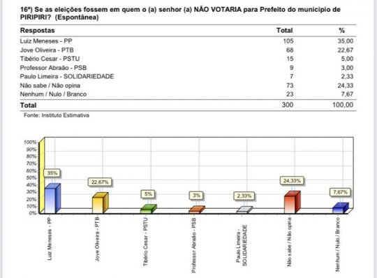 A pesquisa realizada pelo Instituto Estimativa no município de Piripiri aponta a candidata a prefeita Jove Oliveira em primeiro lugar na corrida pela prefeitura do município. O levantamento estimulado mostra Jove com 53% das intenções de voto. Em segundo lugar vem o atual prefeito Luís Meneses (PP) com 36%. Logo depois vem Professor Abraão (PSB) com 0,67%, Paulo Limeira (Solidariedade) com 0,33%. Não sabe/não opina são 6%. Nenhum, branco ou nulo somam 4%.