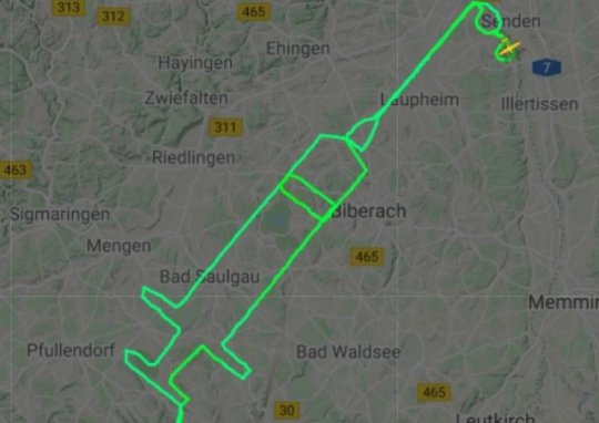 Um piloto de avião ‘desenhou’ uma seringa de 200 km no céu para celebrar o início da campanha de vacinação contra a Covid-19 na Europa.