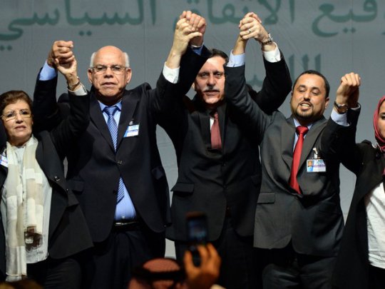 Cantos de "Líbia! Líbia!" irromperam quando representantes dos dois parlamentos firmaram o entendimento ao lado de conselhos locais e partidos políticos na cidade costeira marroquina de Skhirat depois de mais de um ano de duras negociações.