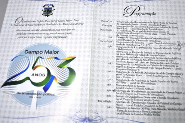 Durante toda essa semana está acontecendo uma maratona de atividades em Campo Maior com inaugurações, assinatura de ordens de serviço para pavimentação asfaltica, conferências, festival de quadrilhas, entrega de títulos de cidadania e a programação encerra com dois dias com a apresentação de grandes bandas reconhecidas nacionalmente.