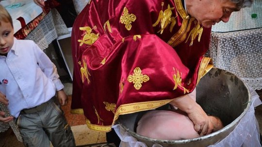 No batismo de uma igreja ortodoxa romena, o bebê é completamente submerso na água três vezes seguidas, enquanto o padre deve segurar seu nariz para garantir que ele não respire na água. Os batismos na Romênia são grandes eventos, às vezes, comparados a casamentos, geralmente com centenas de convidados e uma grande festa.