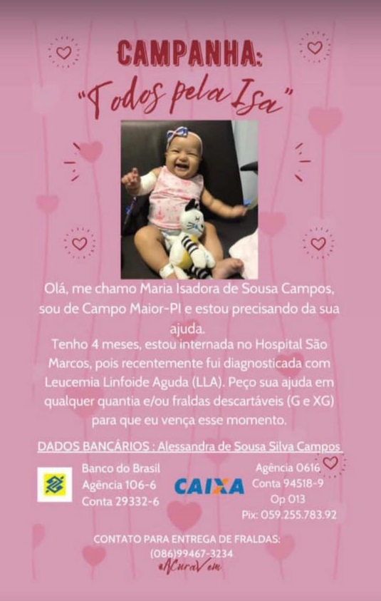 Alessandra de Sousa e Gerson Campos são os pais da pequena Maria Isadora de Sousa Campo, de apenas 04 meses de vida. A família que mora no bairro Flores em Campo Maior, está realizando uma campanha para conseguir ajuda para a bebê que há pouco tempo recebeu diagnóstico de Leucemia Linfoide Aguda (LLA) e está internada no Hospital São Marcos em Teresina.