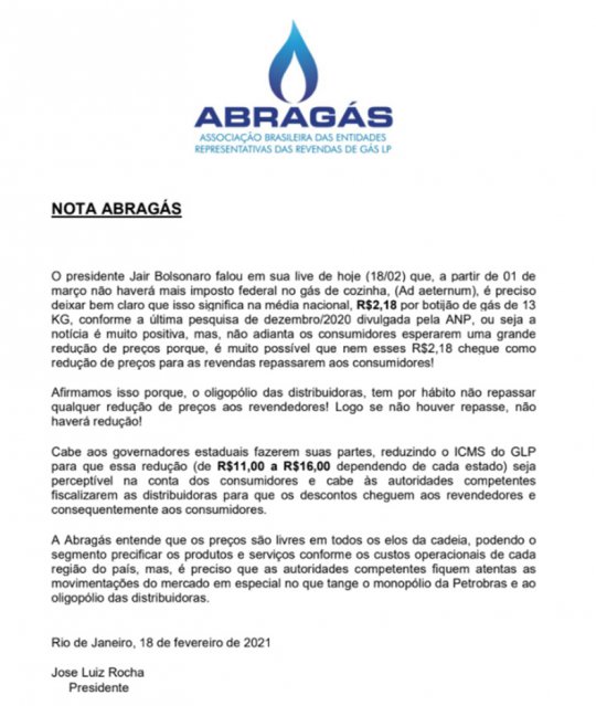 “A Abragás entende que os preços são livres em todos os elos da cadeia, podendo o segmento precificar os produtos e serviços conforme os custos operacionais de cada região do país, mas, é preciso que as autoridades competentes fiquem atentas as movimentações do mercado em especial no que tange o monopólio da Petrobras e ao oligopólio das distribuidoras”, finaliza José Luiz Rocha a nota de esclarecimento.