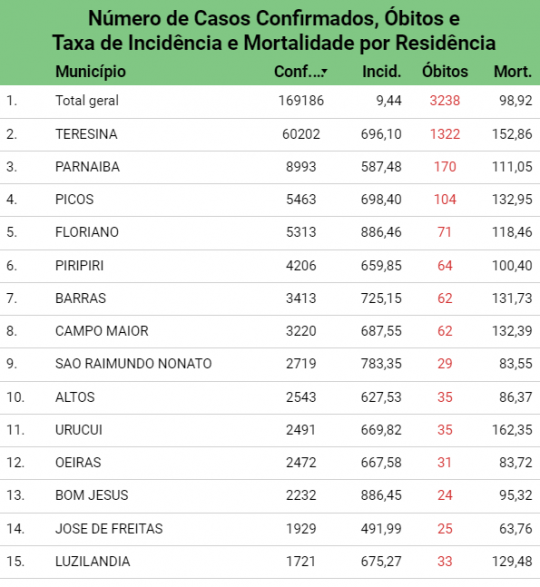 Campo Maior está entre as 10 cidades do estado com maior número de casos confirmados de covid-19, com 62 óbitos no total. A taxa de incidência da doença no município é de 687,55 para cada grupo de 10 mil habitantes.