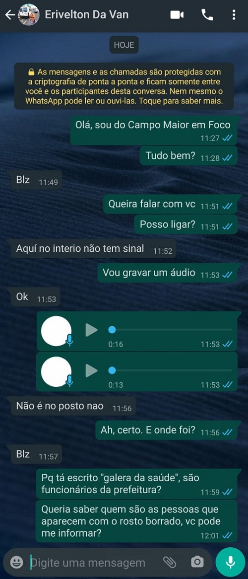 Registro da conversa onde Erivelton nega que a foto tenha sido no Posto de Saúde da Comunidade Água Fria.