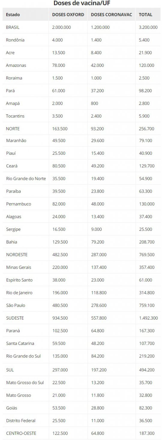De acordo com a distribuição por estado, o Piauí vai receber um total de 40.900: 25.500 da vacina de Oxford/AstraZeneca; e 15.400 da CoronaVac. As informações constam em documentos obtidos pela reportagem da TV Globo e divulgadas no site G1: