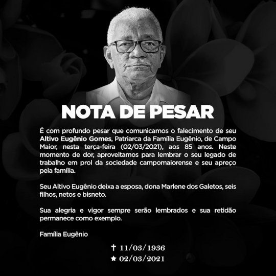 Altivo Eugênio, de 85 anos, patriarca da família Eugênio, faleceu na madrugada desta terça-feira (2), após ter complicações causadas pela covid-19. Altivo encontrava-se internado no Hospital Síri-Libanês em São Paulo para onde foi levado depois de ter testado positivo para a covid.