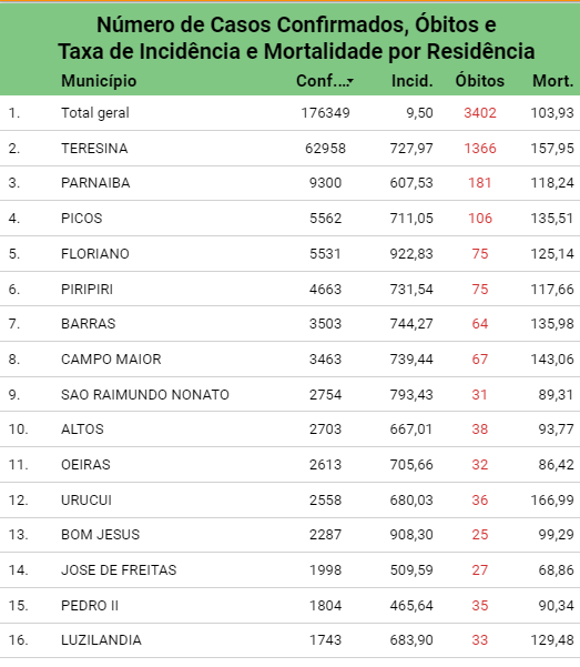 Os números da pandemia seguem em alta no estado. Segundo a SESAPI, foram confirmados nesta quarta-feira (3), 799 casos de covid, e 15 mortes causadas pela doença. A taxa de ocupação de leitos de UTI está em 83%, já de leitos clínicos 64%. Todos os 224 municípios do estado já registram casos de covid-19, e 94,2% das cidades possuem registro de óbito.