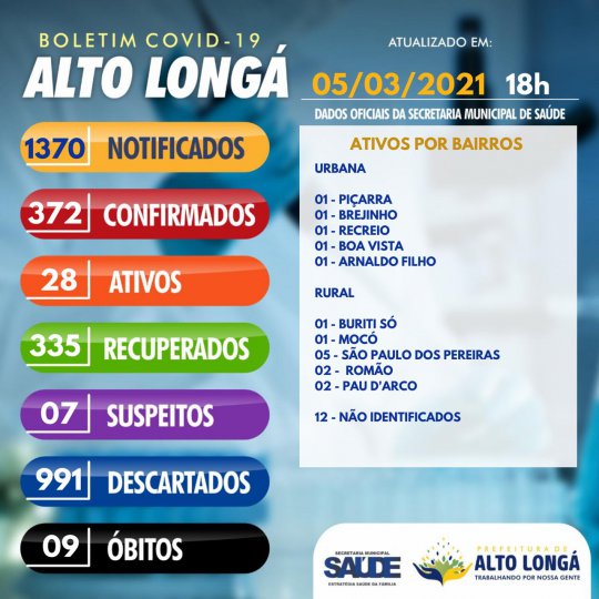 De acordo com o boletim, Alto Longá (PI), contabiliza 372 casos confirmados e 09 óbitos até o momento. Ainda segundo o boletim divulgado pelo município, há 28 ativos, 07 casos suspeitos e 1370 notificados. A Secretaria Municipal de Saúde, atualiza os dados da evolução dos casos a partir de 18 horas da tarde e reforça as medidas de prevenção como, por exemplo, o distanciamento social, o uso obrigatório e correto de máscara, a higienização das mãos com água e sabão ou álcool em gel e evitar aglomerações são hábitos essenciais que devem ser adotados contra a doença.