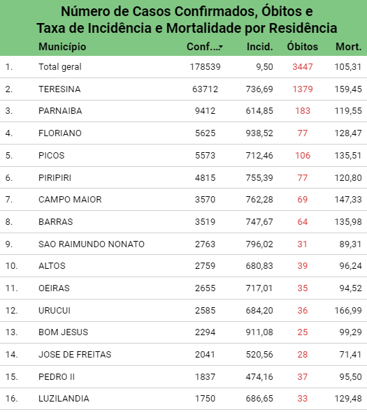 Nesta sexta-feira (5) Campo Maior registrou o maior número de novos casos de covid-19 desde o início de 2021. Em um período de 24 horas foram registrados 85 novos casos da doença, o total chegou a 3.570. O número de óbitos também subiu, de 67 para 69 mortes causadas pela doença.