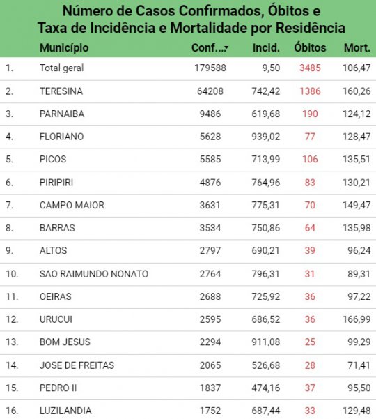 De acordo com a SESAPI, foram confirmados em todo o estado neste domingo (07/03), 284 casos e 25 mortes decorrentes da doença. A taxa de novos casos, bem como a de registro de óbitos estão em alta no estado. A ocupação dos leitos de Unidade de Terapia Intensiva (UTI) está em 83,5%, dos leitos clínico 66,7%,