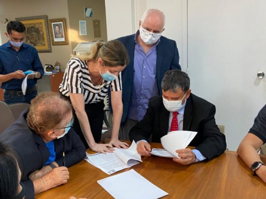 O governador Wellington Dias se reuniu, nesta terça-feira (9), com o prefeito de Parnaíba, Mão Santa, e o secretário de Estado da Saúde, Florentino Neto, para tratar da ampliação de leitos de Covid na região. Na oportunidade, ambos assinaram um termo de cooperação técnica para a reabertura e estruturação do hospital de campanha Nossa Senhora de Fátima.