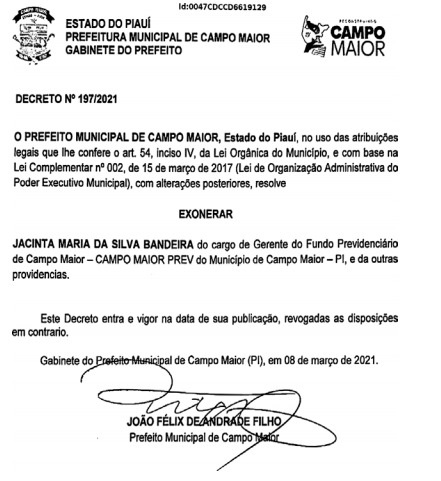 Nesta quarta-feira (10), a professora Jacinta Bandeira, foi exonerado do cargo de Gerente do Fundo Previdenciário de Campo Maior (Campo Maior Prev). Jacinta foi candidata a vereadora na eleição municipal de 2020, no grupo do atual prefeito João Félix (MDB). A professora obteve no pleito 366 votos ficando na suplência.