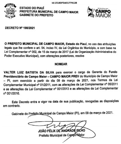 Para ocupar o cargo deixado pela professora, o prefeito João Félix nomeou o advogado Valter Luiz Batista da Silva. A nomeação nessa quarta-feira (9). O novo gerente do Campo Maior Prev. também foi candidato a vereador em 2020, ficando na suplência do Partido Socialista Brasileiro (PSD).