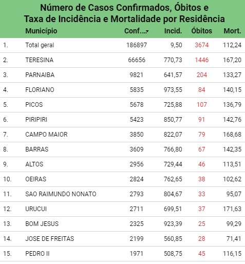 Foram confirmados ainda 20 novos casos de infecção pela covid-19. Campo Maior já possui 3.850 casos acumulados. A taxa de incidência no município para cada grupo de 10.000 habitantes já é de 822,07.