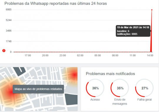 O site DownDetector, que agrega incidentes de usuários em serviços digitais, registrou um pico de reclamações sobre o mensageiro e apontou que havia falhas.