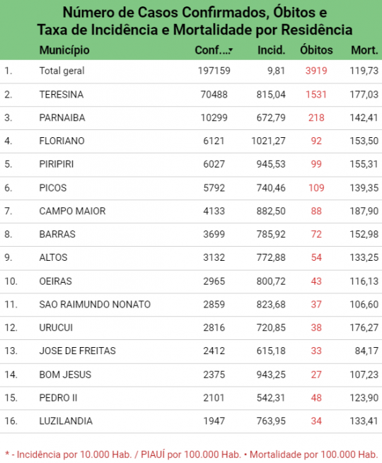 A taxa de incidência da covid em Campo Maior, para cada grupo de 10.000 habitantes é de 882,50. Já a de mortalidade está em 187,90.