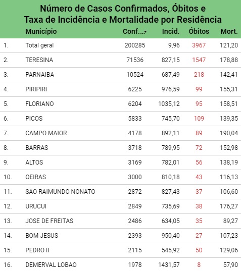 Ainda segundo os dados da SESAPI, Campo Maior chegou a 89 mortes causadas pela covid. A cidade tem uma das maiores taxas de incidêcncia da doença, 892,11 para cada grupo de 10.000 habitantes.