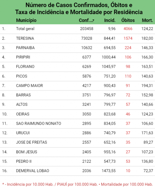 Com uma das maiores taxa de incidência da doença no Piauí, 900,43. Campo Maior é a 6ª cidade do Piauí com o maior número de casos confirmados, ficando atrás apenas de Teresina, Parnaíba, Piripiri, Floriano e Picos.