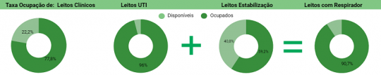 Com a alta em número de caos e mortes, a taxa de ocupação dos hospitais tamém aumentou. A taxa de coupação dos leitos de Unidade de Terapia Intensiva (UTI), chegou a 96%; dos leitos clínicos entá em 77,8%; já dos leitos de estabilização 59,2%.