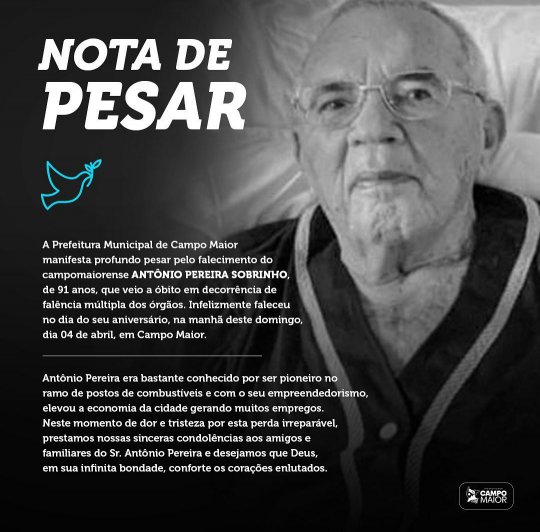 A Prefeitura de Campo Maior emitiu a nota de pesar, comunicando o falecimento do Sr. Antônio: