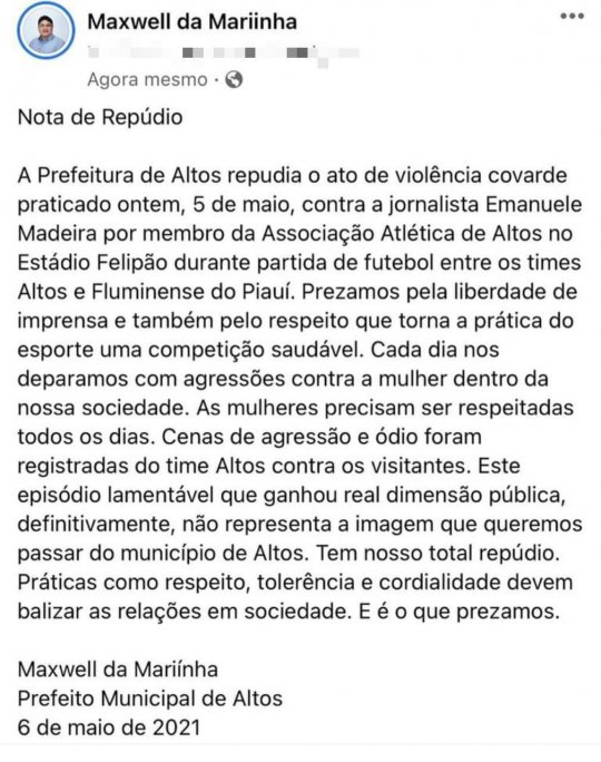 "A Associação Atlética de Altos, vem respeitosamente diante de seus torcedores e toda sociedade piauiense, COMBATER toda forma de violência, especialmente a ocorrida ontem, contra uma MULHER, no exercício de suas funções laborais, após o jogo na cidade de Altos.