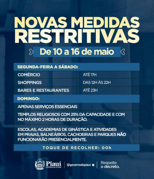O governador Wellington Dias baixou novo decreto que dispõe sobre as medidas a serem tomadas no combate ao coronavírus. As medidas passam a valer pelos próximos sete dias tendo início a partir desta segunda-feira (10) até o domingo (16).