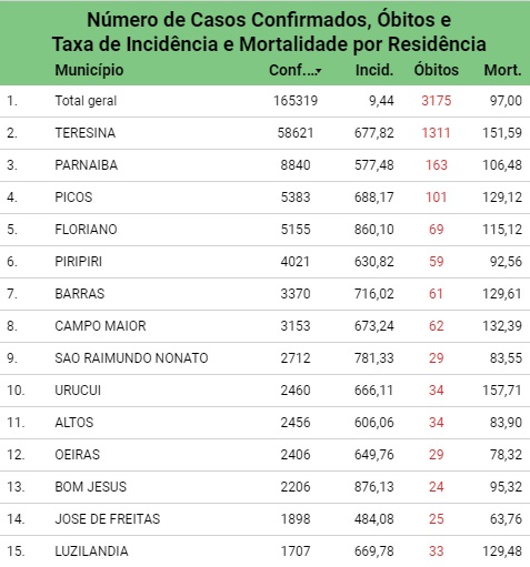 Segundo o boletim da Secretaria de Estado da Saúde (SESAPI), o número geral de casos confirmados está agora em 4.834. Já os registros de óbitos em Campo Maior, decorrentes da covid-19 está em 121.