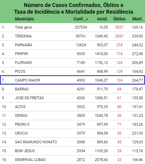 O município de Campo Maior, confirmou neste domingo (16) mais uma morte provocada pela covid-19, de acordo com os números do boletim epidemiológico da Secretaria de Estado da Saúde do Piauí. O nome da vítima não foi informado. Com a atualização, a cidade contabiliza agora 124 mortes provocadas pela doença.