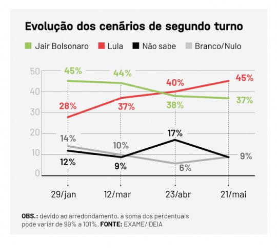 O ex-presidente Luiz Inácio Lula da Silva (PT) tem 45% das intenções de voto contra 37% do presidente Jair Bolsonaro (sem partido) em um eventual segundo turno na disputa pela presidência do Brasil, caso as eleições fossem hoje. O petista ampliou a vantagem desde a última sondagem, realizada há um mês, e consolidou o favoritismo ao Palácio do Planalto.