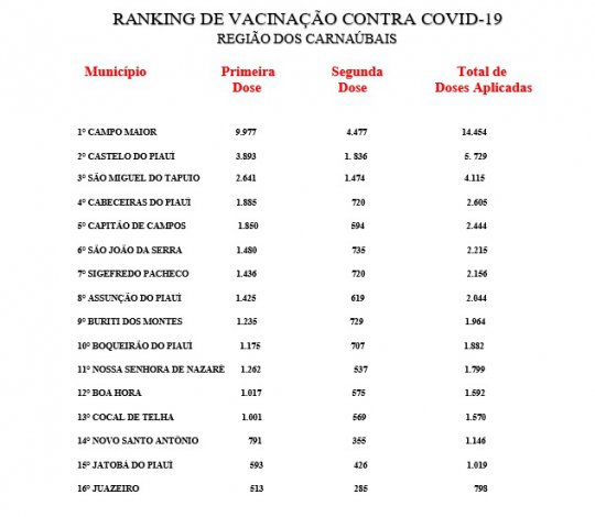 Até o momento, o Piauí possui 838.185 pessoas vacinadas contra Covid-19 de acordo com a SESAPI. CONFIRA O RANKING COMPLETO DA REGIÃO DOS CARNAÚBAIS: