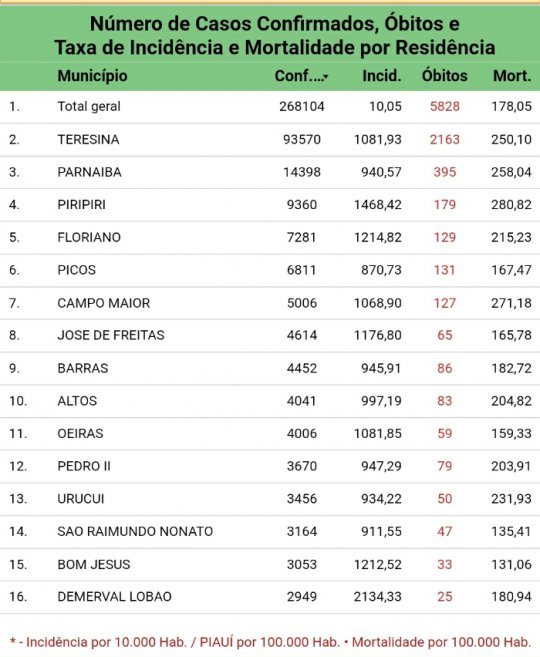 O mesmo boletim trás os dados referentes aos óbitos ocorridos em Campo Maior, ocasionados pela covid. No total, 127 pessoas já prederam a vida por causa da doença.