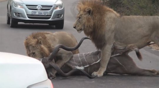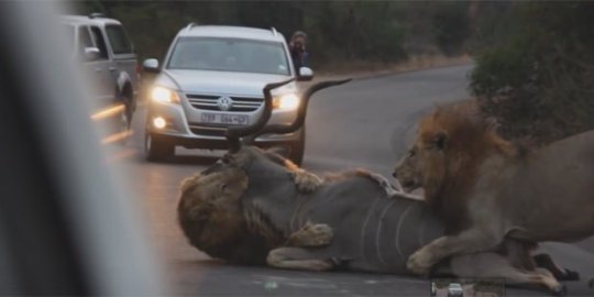 Dois leões chocaram turistas ao matarem um cudu, espécie de antílope, em meio aos carros dos visitantes em uma estrada no Parque Nacional de Kruger, na África do Sul. Publicado no mês passado, o vídeo recebeu mais de 75 mil visualizações.